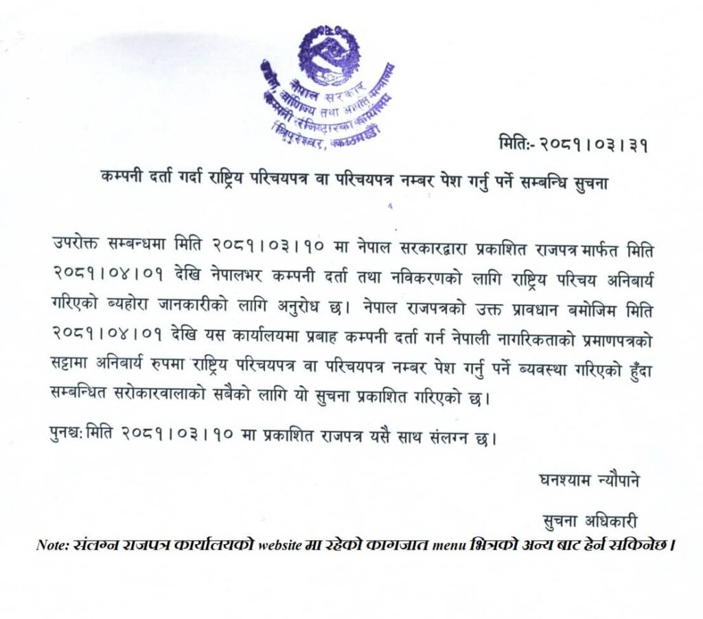 The Government of Nepal has announced a significant update regarding the registration and renewal of companies. As per the provisions published in the Nepal Gazette on 2081.03.10, it is now mandatory to submit a National Identity Card (राष्ट्रिय परिचयपत्र) or Identity Card number for these processes.